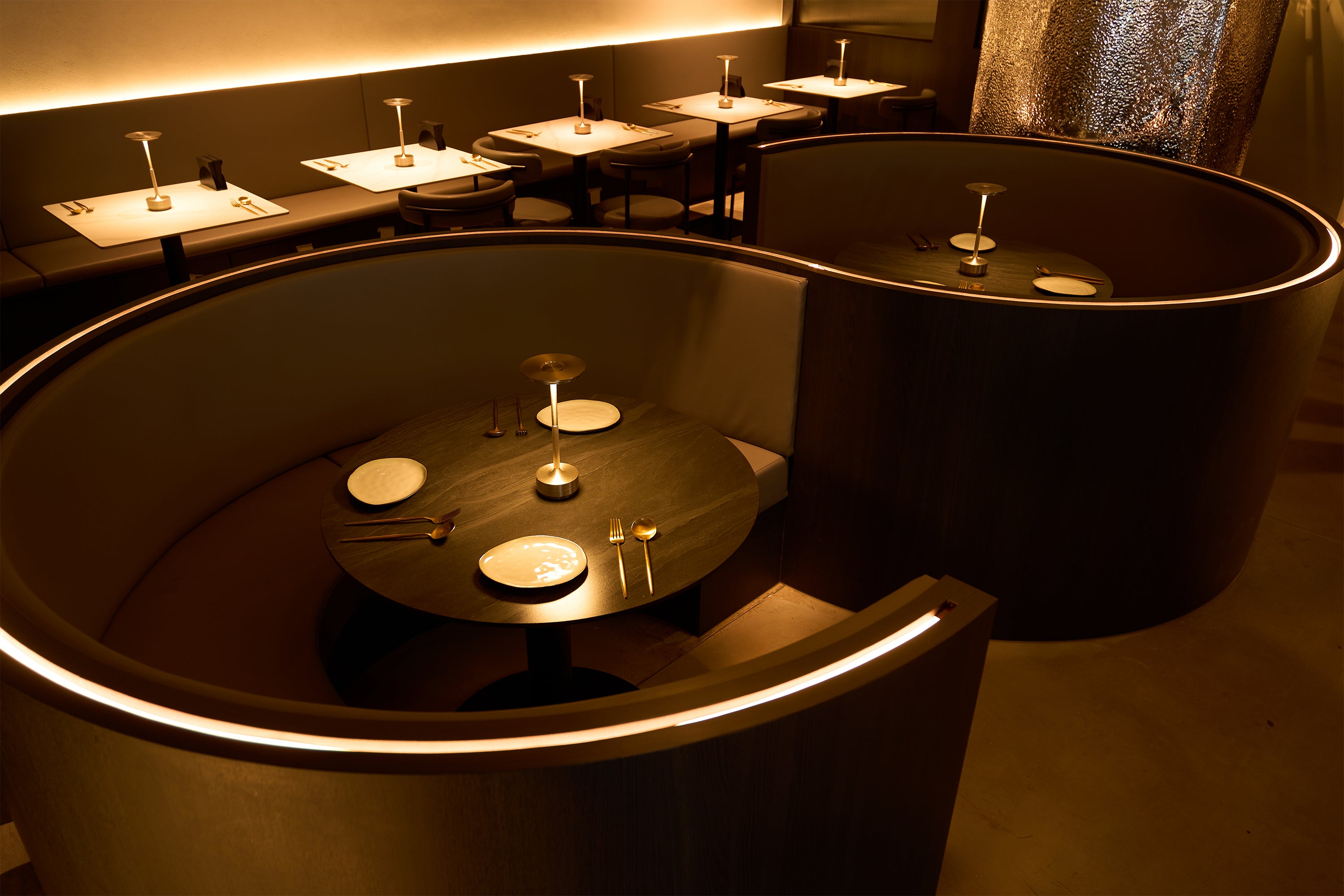 - Curved private booths for intimate conversations